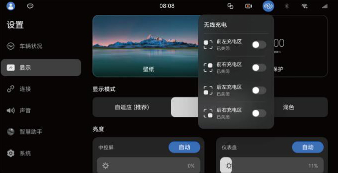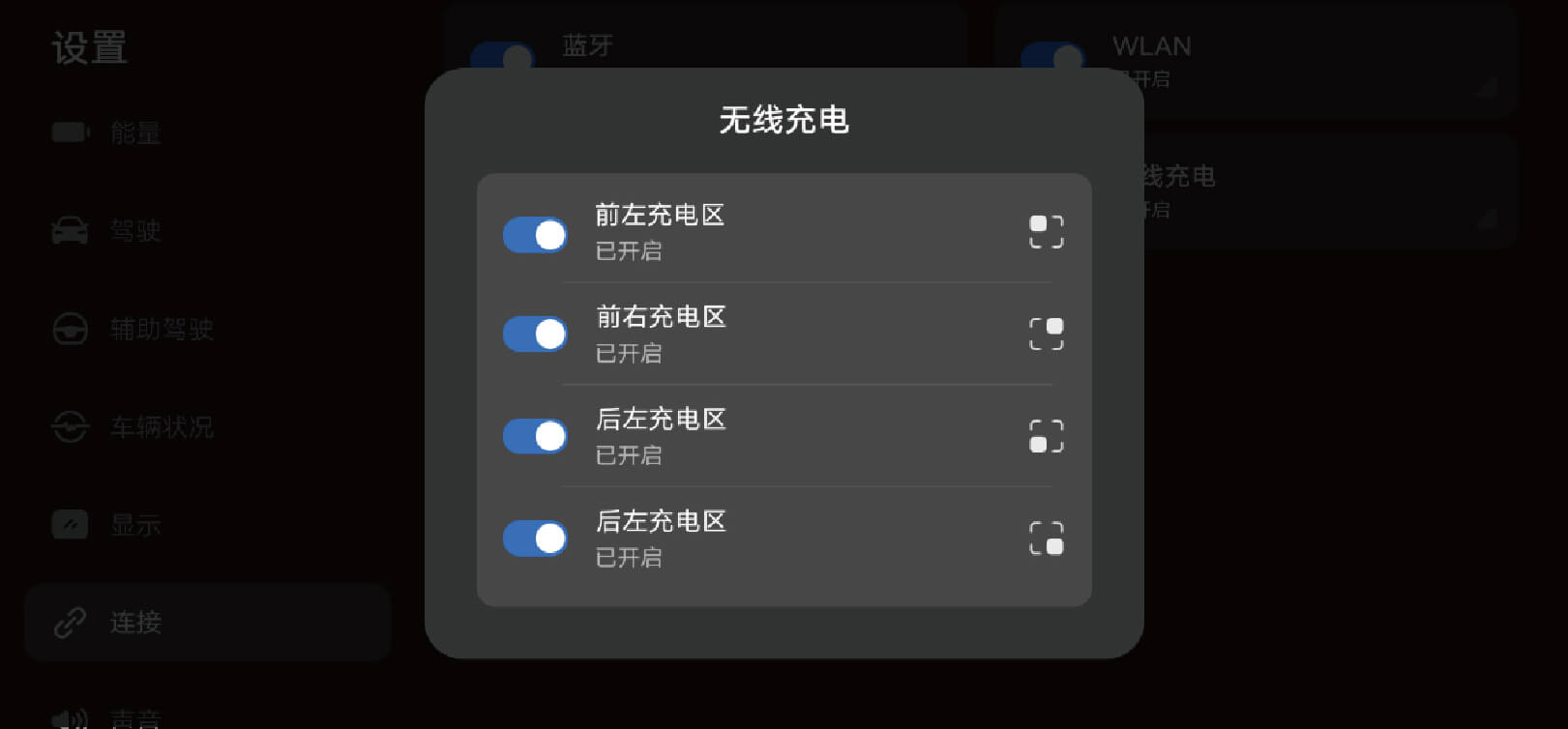- 在中控屏设置 > 连接界面,开启对应区域的无线充电开关。