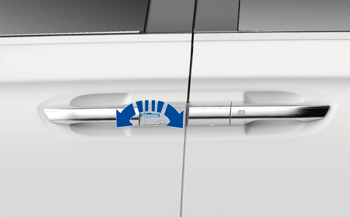 车辆退出 READY 模式后,关闭所有车门和电动后备箱,携带智能钥匙或蓝牙钥匙,按下前车门把手上的按钮,所有车门锁止,左右转向灯闪烁一次,喇叭鸣响一次,同时外后视镜自动折叠。