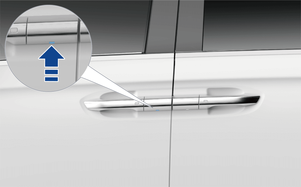 车辆闭锁状态下,携带智能钥匙或蓝牙钥匙,按下前车门把手上的按钮(上图所示),所有车门解锁,左右转向灯闪烁两次,同时外后视镜自动展开。