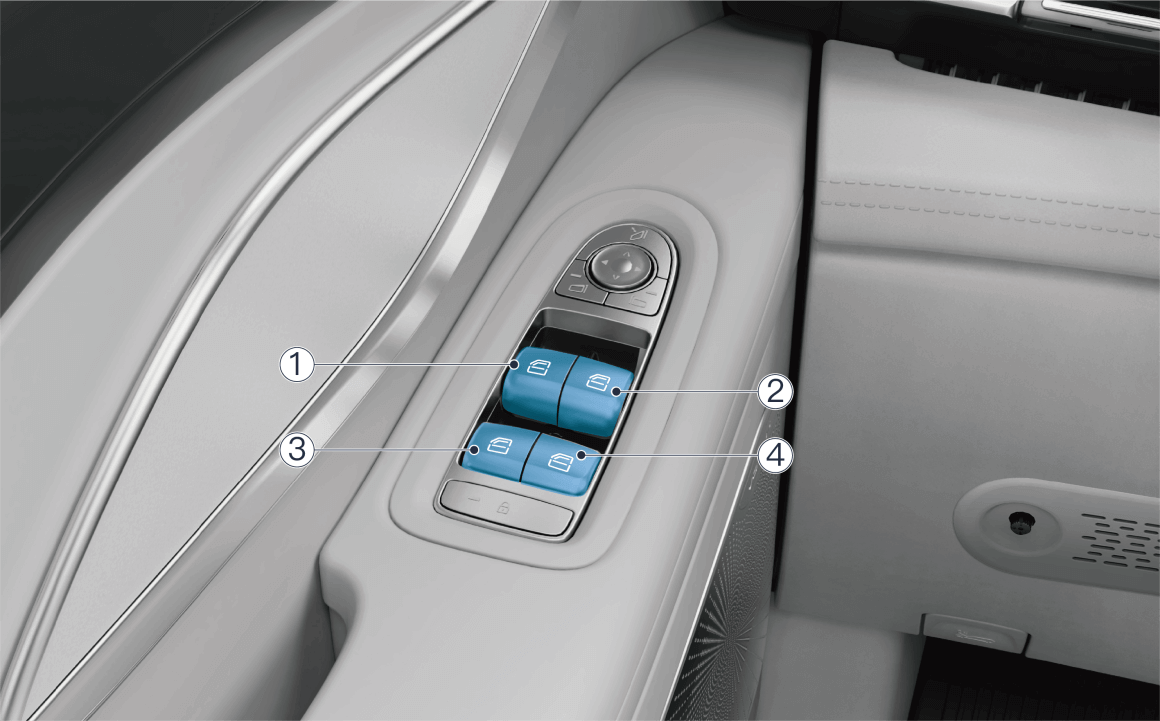按下左前主驾车窗控制按键 ①,车窗下降,提起按键,车窗上升。用力按下 / 提起按键可触发车窗一键升降模式,车窗将自动下降 / 上升至完全开启 / 关闭。在车窗运行过程中,反向操作按键可以随时停止车窗运行。