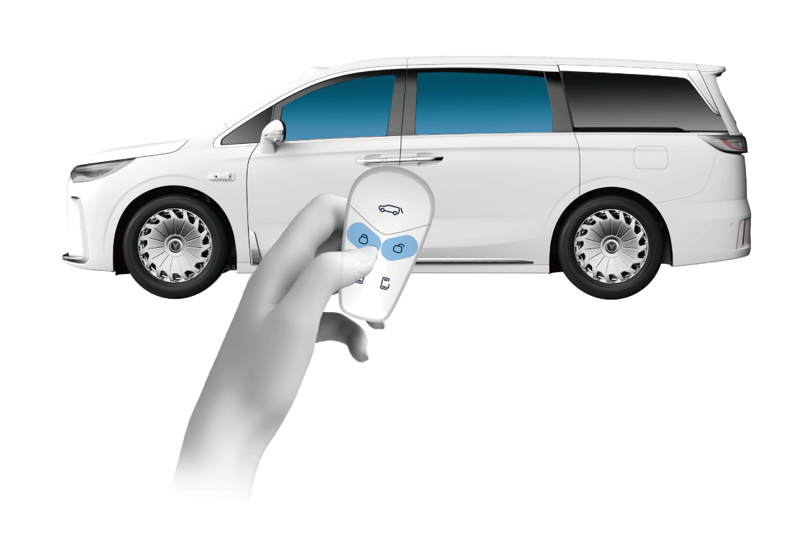 离车并关闭所有车门,长按智能钥匙锁止 / 解锁按键,可控制四门车窗玻璃自动上升 / 下降。