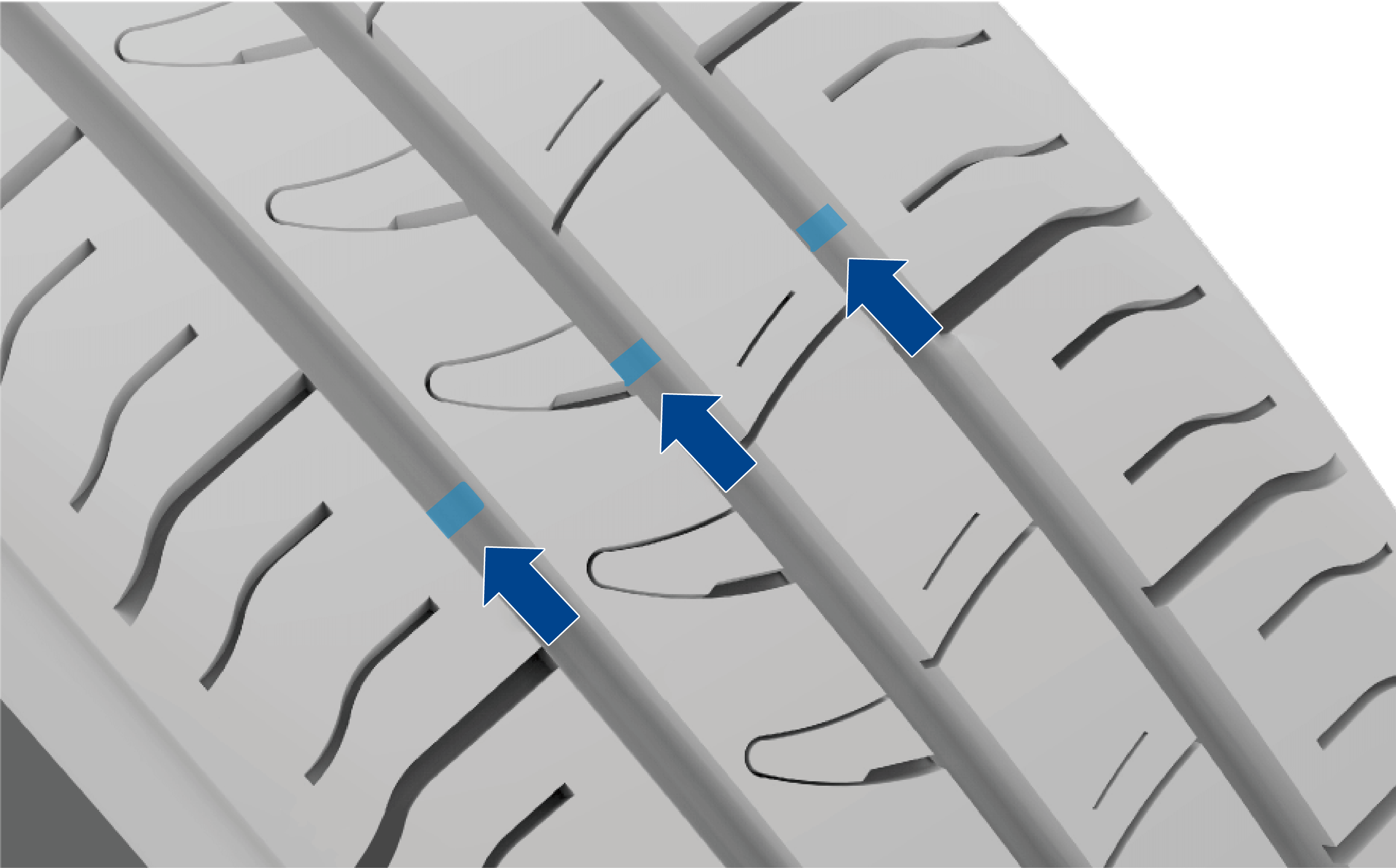 上图箭头为胎面磨损标记,用于指示轮胎胎面花纹磨损情况。如果胎面花纹磨损到标记位置,轮胎将无法继续使用,必须及时更换。