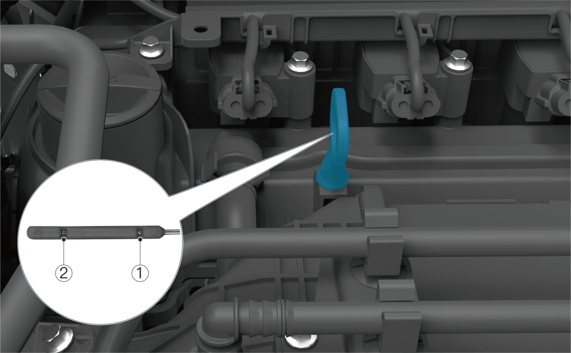 拉出机油尺,检查油位。油位应位于上限点 ① 和下限点 ② 之间。