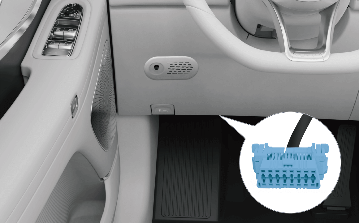 诊断接口(OBD)位于仪表板左下方,拆下底部饰板即可见。用于车辆电子控制单元与诊断设备的数字通讯。通过诊断仪等设备连接此接口可获得车辆VIN信息。