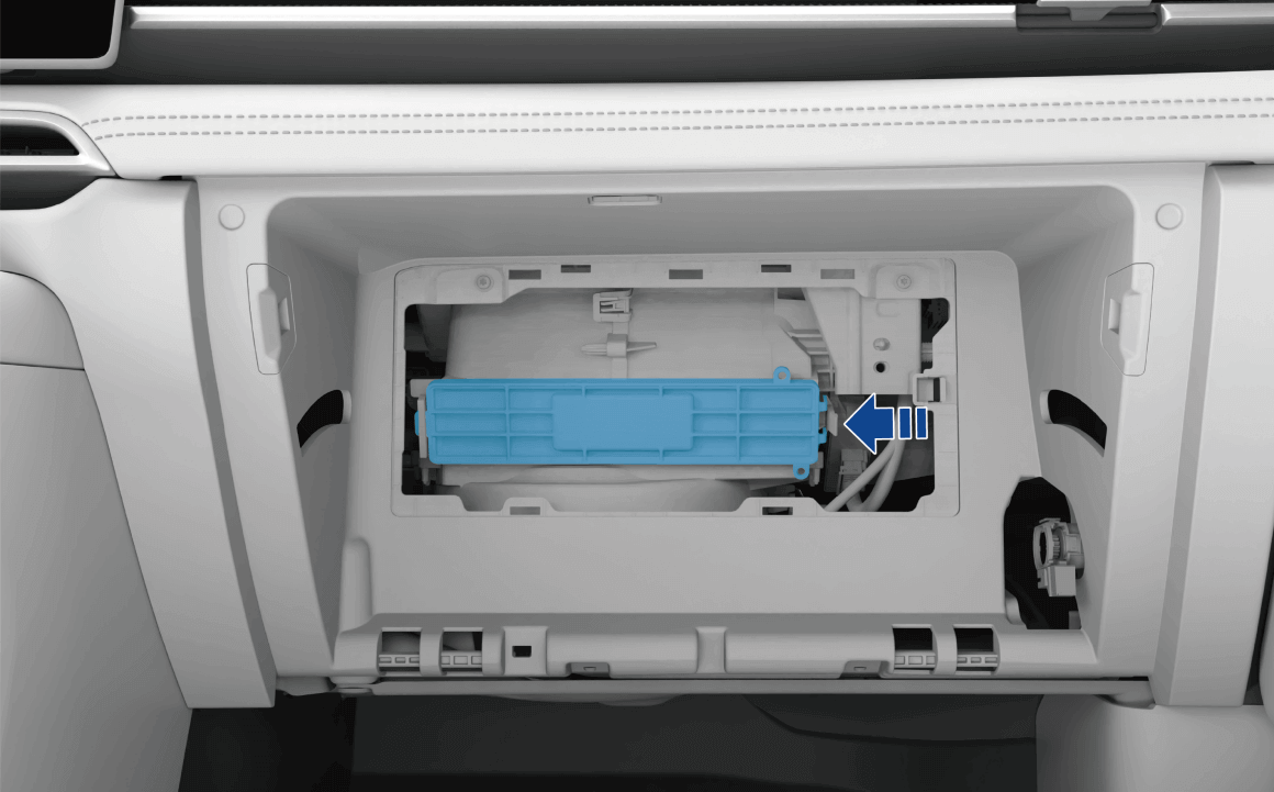 - 按压空调滤清器护盖右侧固定卡扣,取出空调滤清器护盖;