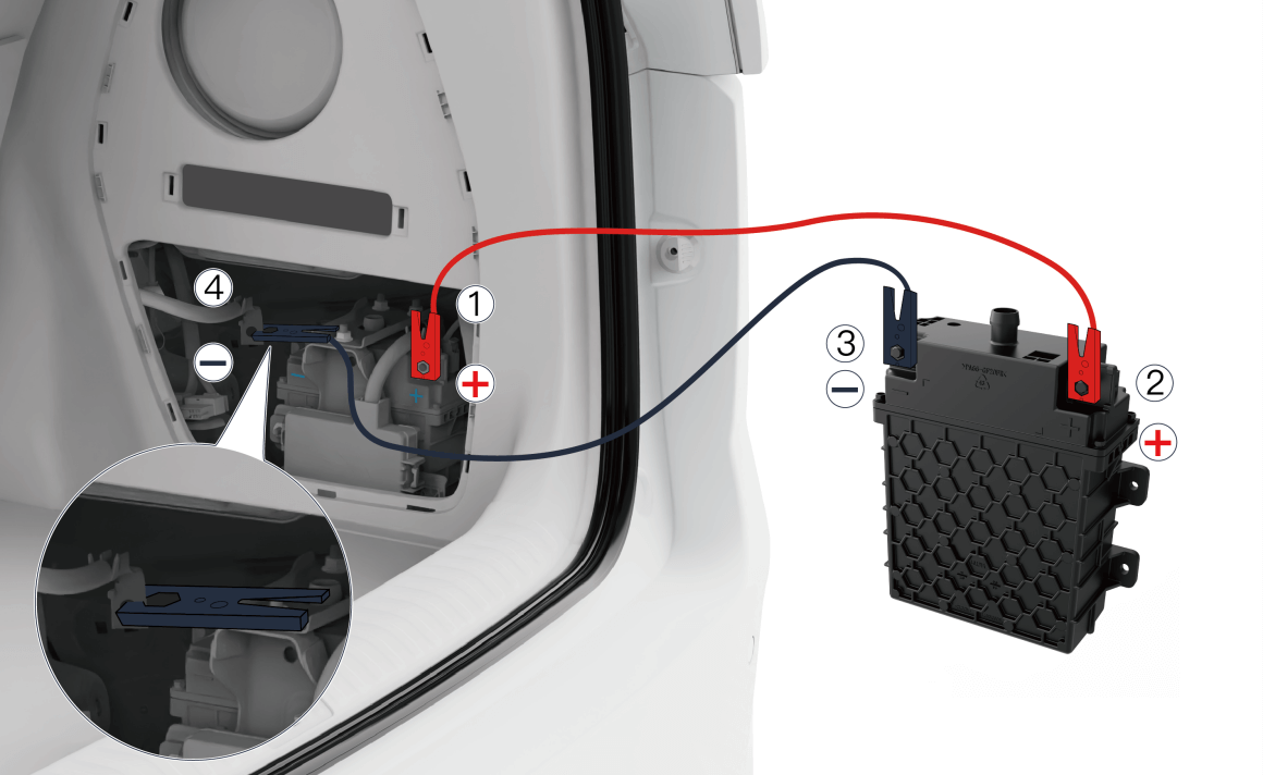 - 将黑色电缆的 ③ 端连接到供电蓄电池的负极(-)上,将黑色电缆另一端 ④ 牢固连接到亏电蓄电池的负极电缆上;