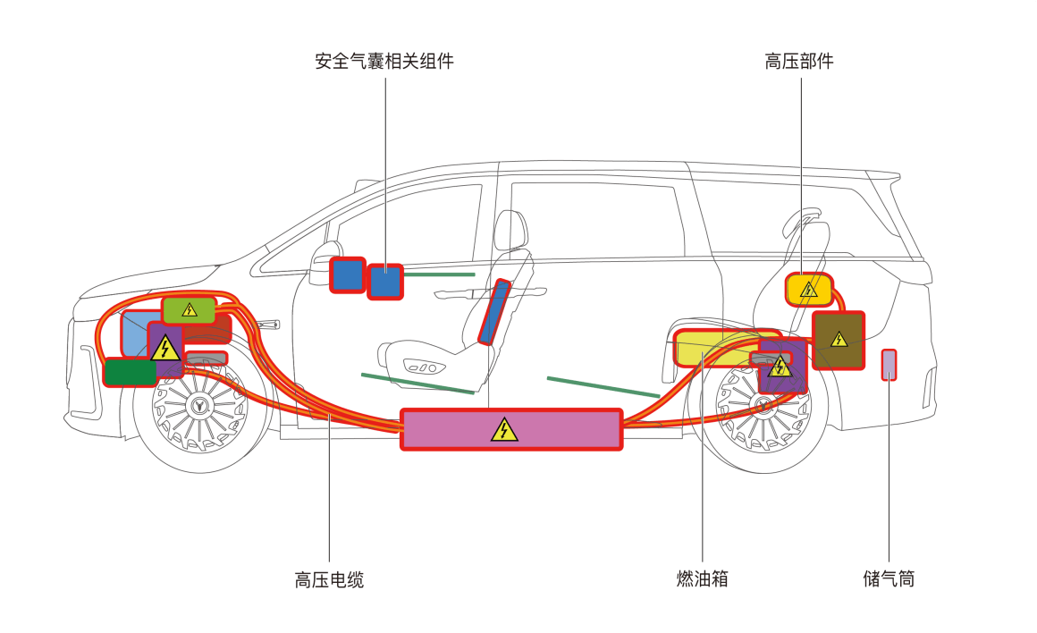 车辆高温、高压区域为禁止切割区域,如安全气囊相关组件、高电压部件、空气悬架储气筒*等。其他部位如需切割,救援人员应穿戴专业防护装备,选用合适的切割设备进行切割操作。