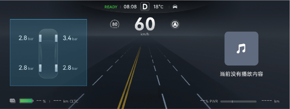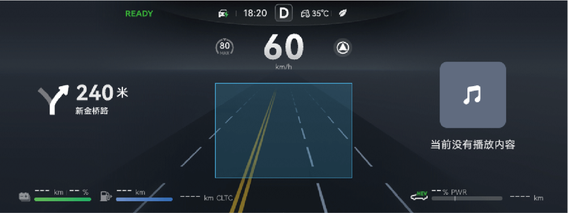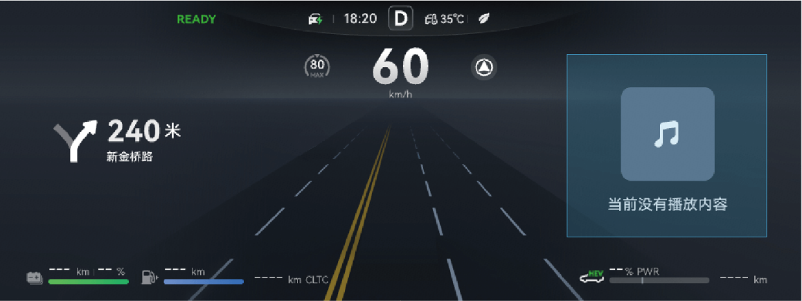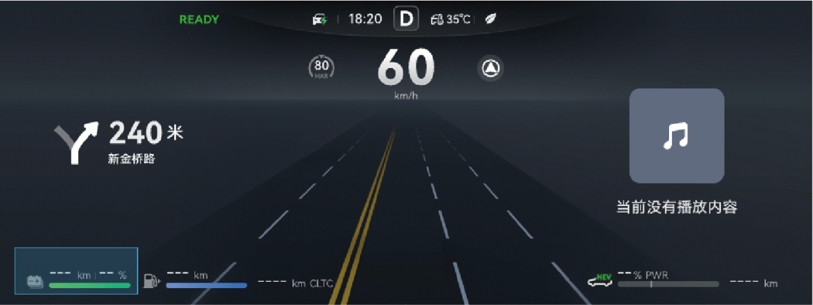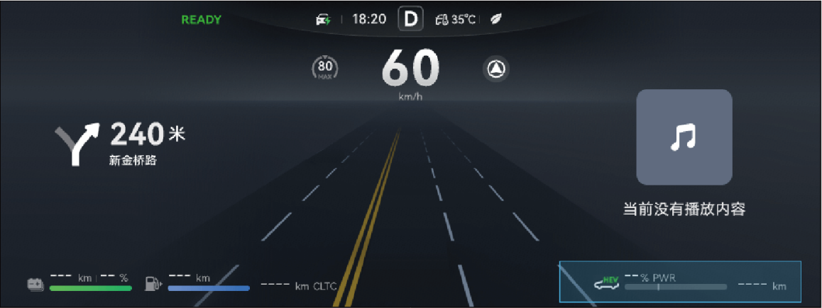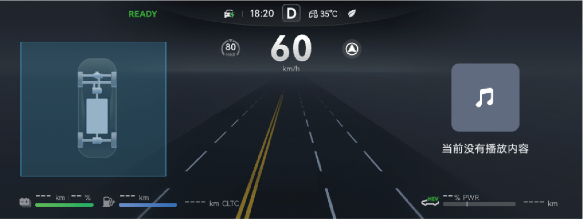 电源状态在 READY 模式下,整车行驶时,仪表根据整车功率信号实时显示当前功率和制动能量回收功率。