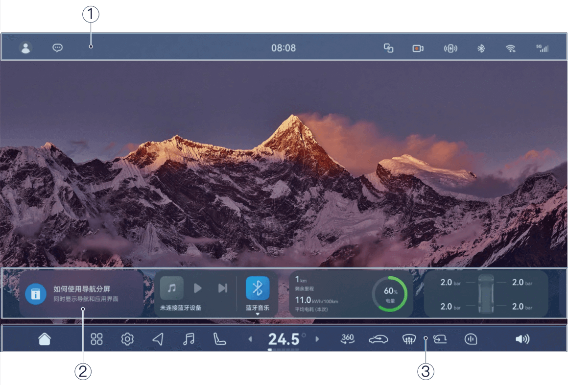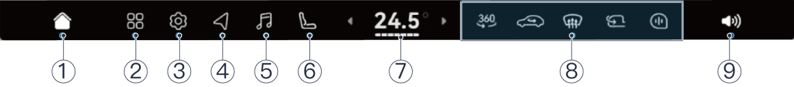 | ③ | 工具栏 | - 便捷操作常用功能,例如:前除霜、空调与座椅调节、自动循环模式、音量开关。 - 长按 Home 键进入多任务中心,可以快速查看、进入、关闭最近任务。 |