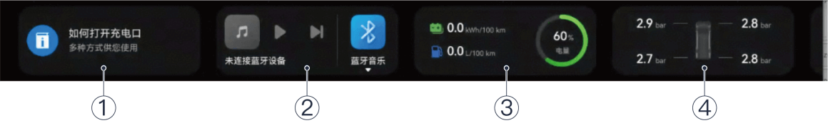 | ④ | 胎压卡片 | 可以实时查看胎压信息,也可点触卡片可进入“设置 > 车辆状况”界面。 |