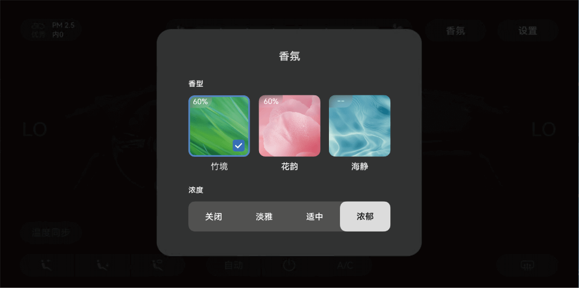 在中控屏底部工具栏中部点触空调区域,再点触弹窗右上角的 >,进入空调设置界面,点触“香氛”,选择不同“香型”、香氛“浓度”或“关闭”香氛系统。