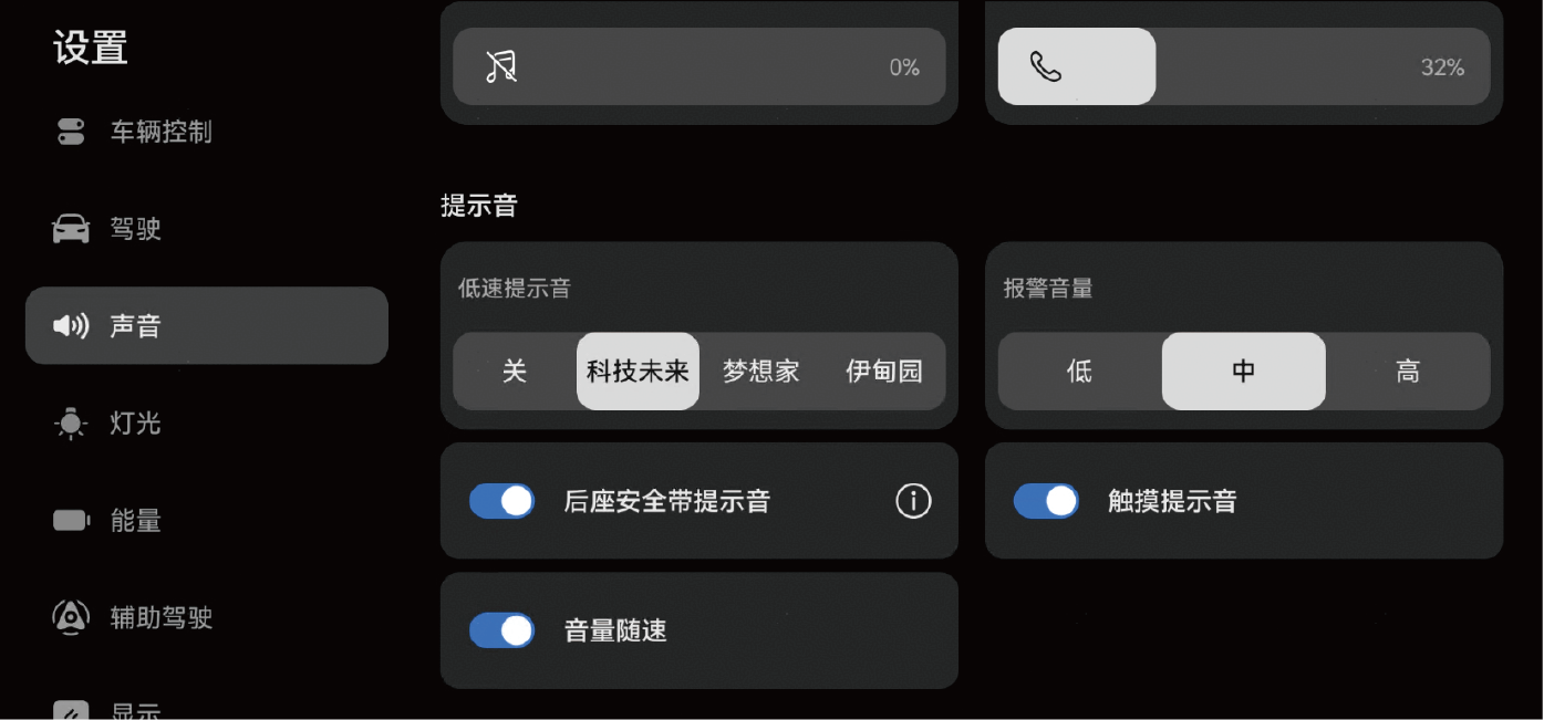 因车辆配置存在差异,部分车型仅支持低速提示音的开启或关闭,请以车辆实际情况为准。