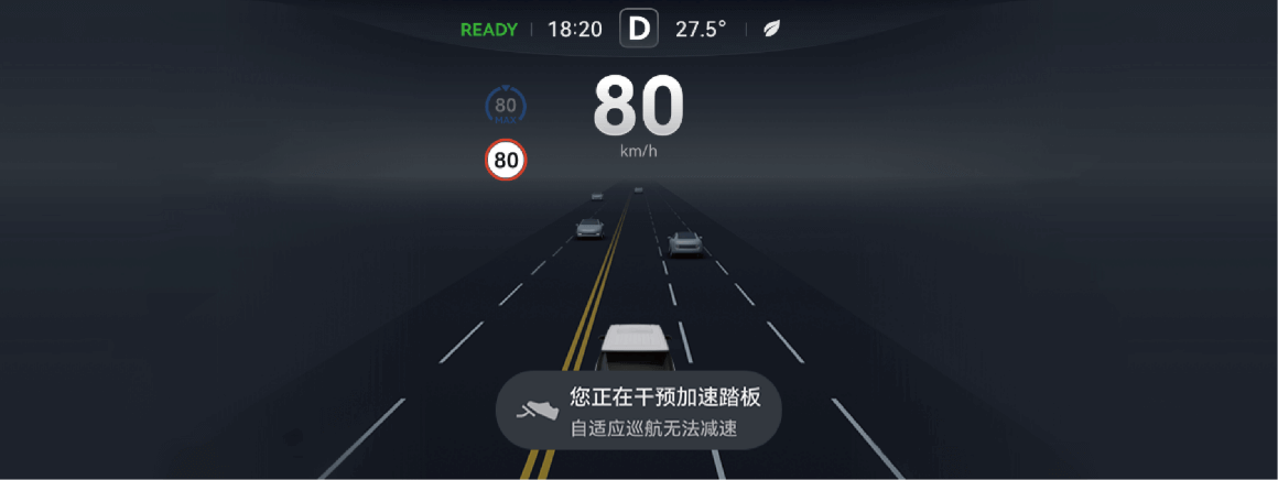 - 干预加速踏板期间,车辆的目标车速可调节但不生效,如在干预加速踏板期间调节了车速,则新的目标车速需在驾驶员停止干预加速踏板后才会生效。