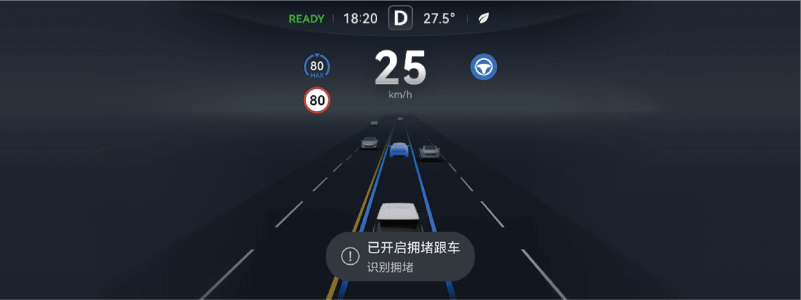 驾驶员将跟车时距调为 1 挡,车辆会在车速 < 30 km/h 且路况拥堵时进入拥堵跟车模式。