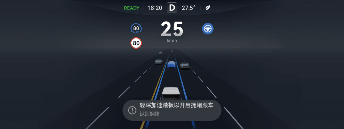 - 在组合仪表上显示 “轻踩加速踏板以开启拥堵跟车” 时踩加速踏板或减小跟车时距,开启拥堵跟车。详情请参阅调节跟车时距。