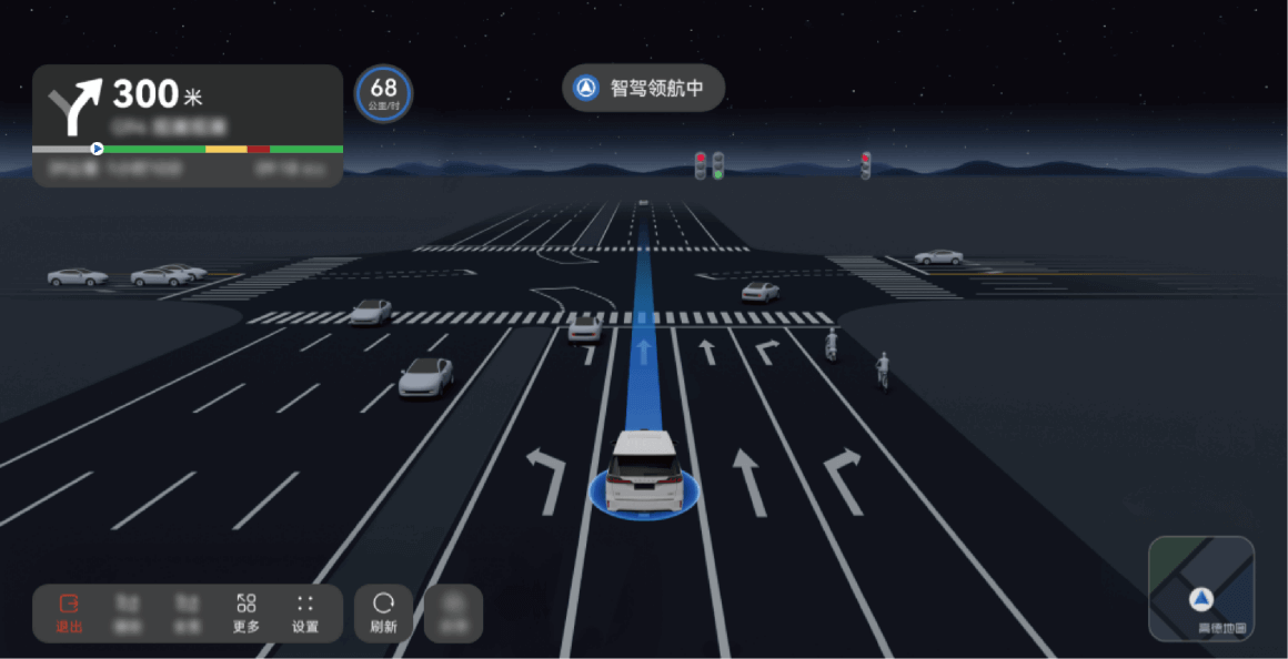 - 在中控屏上,点触 ADS APP 上的 ADS 状态岛卡片(即下图中“智驾领航中”字样所在卡片)。点触后,若车辆可以切换至 LCC,则 ADS 状态岛会显示“已降至车道巡航”的文字提示,数秒后消失。