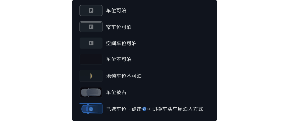 选择车位时,若车位框出现 图标,则驾驶员可点触该图标切换车头车尾泊入。否则表明当前车位不支持切换泊入方式。