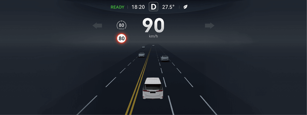 - 当车速超过相对告警阈值时,组合仪表上的限速图标呈现呼吸效果(红色圆圈动态闪烁),可选伴有提示音(若设置)。