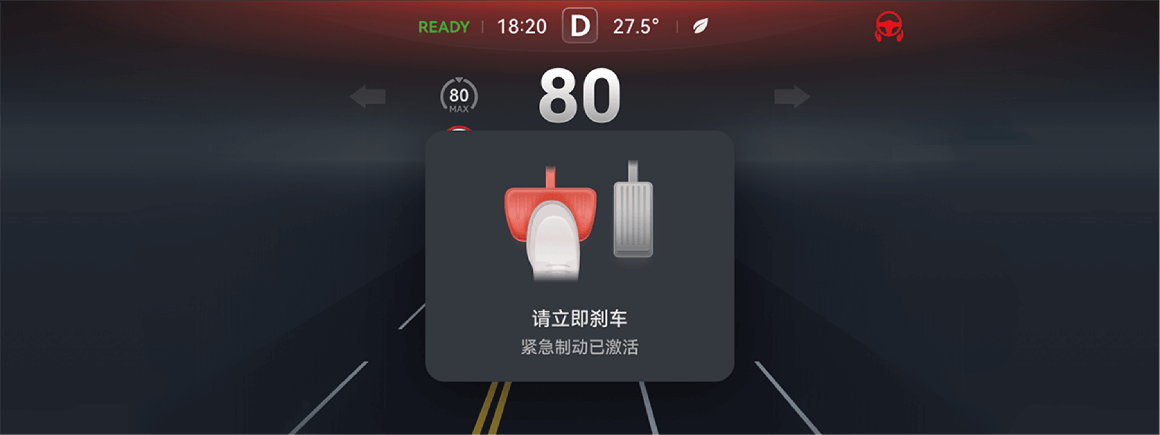 - 发生 AEB 后,驾驶员应立即采取措施,避免车辆陷入进一步的危险中,避免因紧急制动导致其他事故或伤害。例如,对于确实有碰撞风险的场景,驾驶员应及时踩制动踏板确保制动;对于不必要的制动,驾驶员可以通过快速踩下加速踏板、转动方向盘或松开加速踏板后再次踩下加速踏板的方式来中断制动。