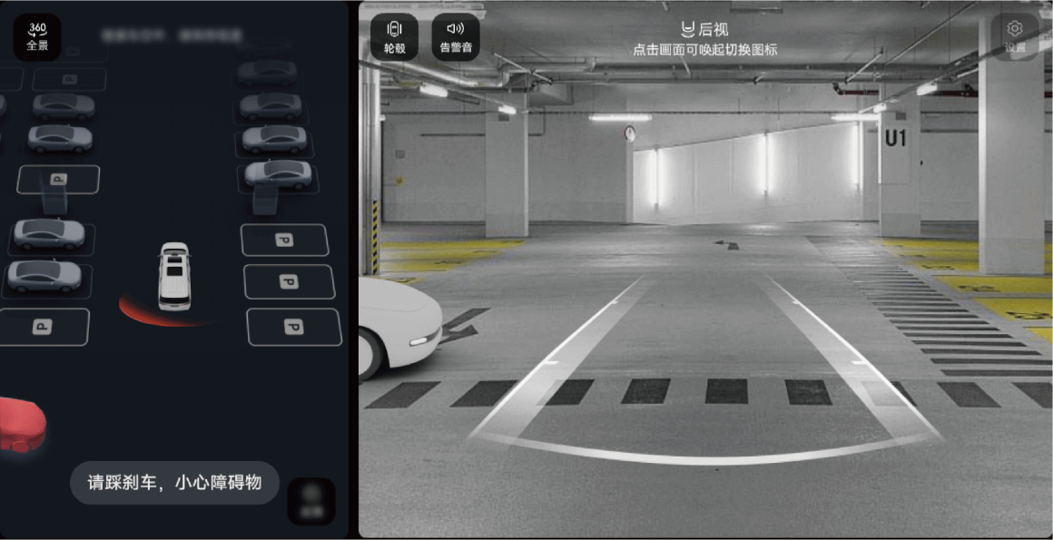 实施 RCTB 时,中控屏上会在自车侧后方来车方向显示动态红色弧线,并将风险目标红色高亮显示,伴有“请踩刹车”的文字提示,提醒驾驶员采取制动措施。
