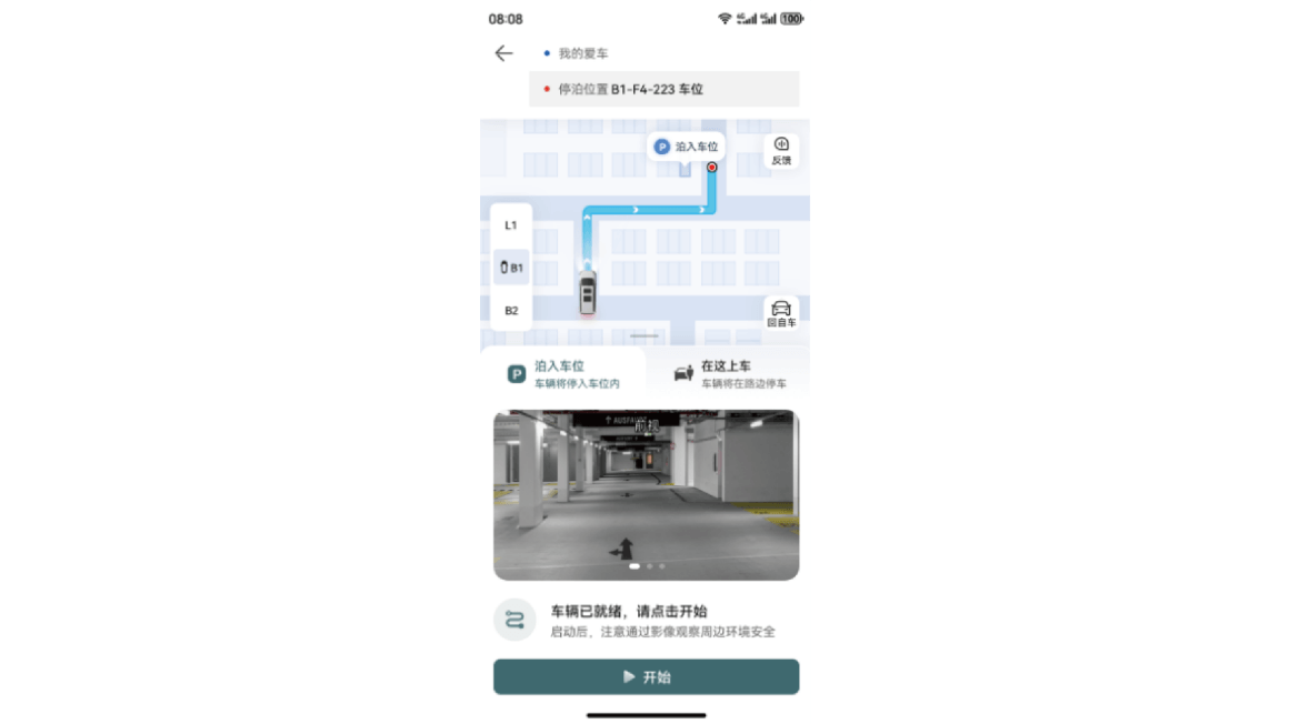 若切换为“在这上车”页签,点触“开始”,车辆将在目标车位附近的路边停车。