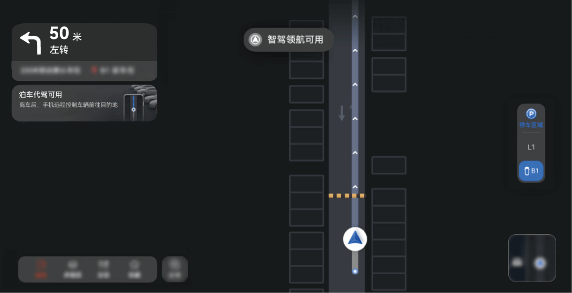 - 驾驶员首次驶入支持 VPD 的地下停车场,若未观察到“开启离车泊入”提示卡片,可在中控屏界面选择一个目标车位,点触“去这里”发起导航后,也可观察到“开启离车泊入”提示卡片。此种情况下,若目标车位被占,车辆将在当前楼层中寻找其他可泊空车位。