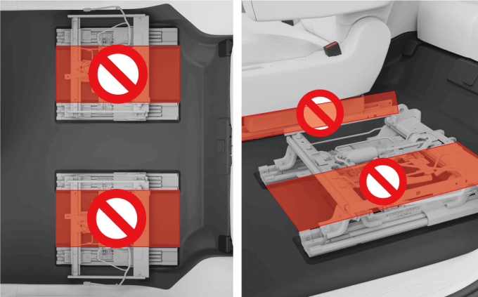 以加装地板为例,下图座椅下方区域里不允许铺设地板,与线束接触的地板边缘需光滑无毛刺,金属地板还需包裹保护,否则可能因线束运动磨损影响车辆正常使用、甚至还有电路短路的风险。如加装地板与二排座椅腿托间隙过小,可能会导致腿托在抬升、伸缩调节过程中与地板产生干涉,造成二排座椅腿托面套损坏。