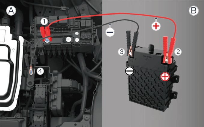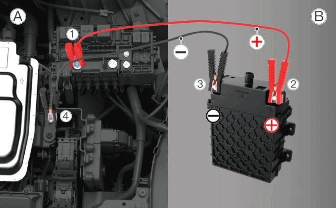 将黑色电缆的 ③ 端连接到供电车辆 B 蓄电池的负极(-) 上,启动供电蓄电池车辆,然后将黑色电缆另一端 ④ 牢固连接到亏电车辆 A 前机舱负极搭铁点上;