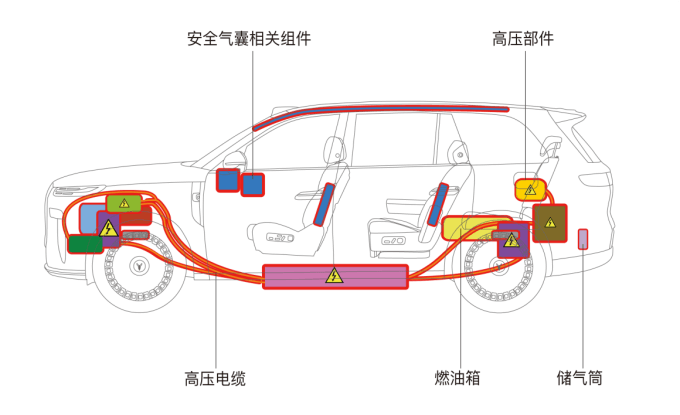 车辆高温、高压区域为禁止切割区域,如安全气囊相关组件、高压部件、空气悬架储气筒等。其他部位如需切割,救援人员应穿戴专业防护装备,选用合适的切割设备进行切割操作。
