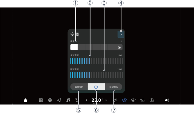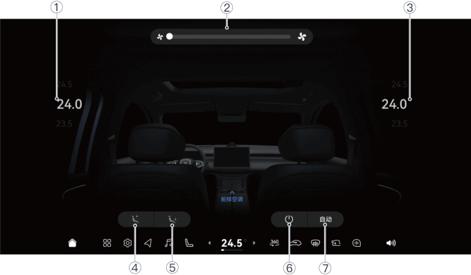 | ① 风量 | 风量调节,左右滑动或点击档位调节主驾风量,支持1-7挡风量调节。 |