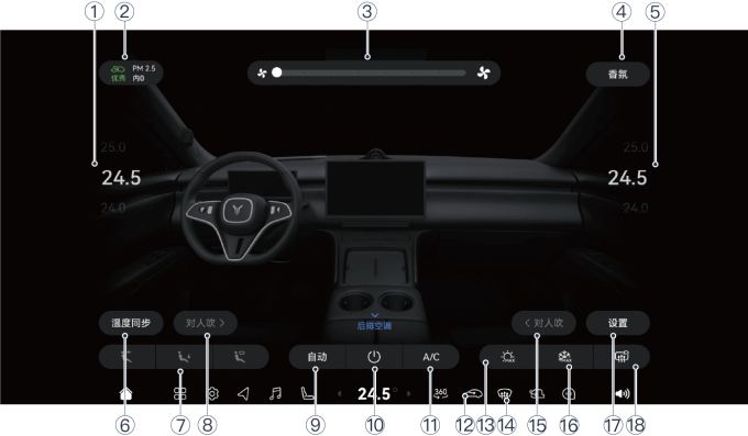 | ⑤ 温度同步 | 点击可开启或关闭“温度同步”,开启后,空调会智能同步前排温区或全车温区。 |
