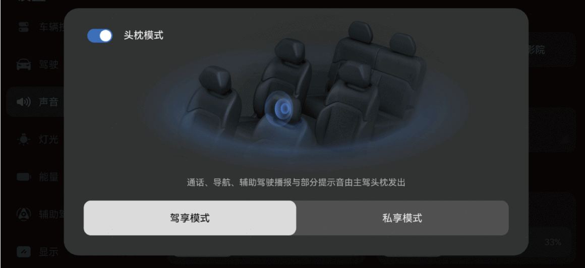 - “私享模式”:除提示音外,其他声音仅为主驾播放,这样既不影响乘客休息,驾驶员也可以正常听音乐或导航。