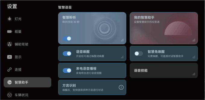 您可以在中控屏上点击“设置 > 智慧助手”,在智慧语音界面中设置如下功能。