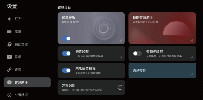 在中控屏点击“设置 > 智慧助手 > 语音技能”。