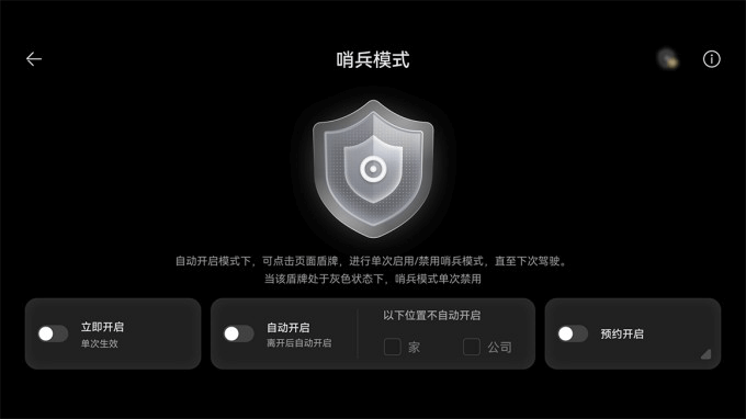 - 自动开启:启用后,车辆会在驾驶员离开车辆并锁车时,约 1 分钟内自动开启哨兵模式。自动开启长期生效,驾驶员无需每次手动开启。若车辆中控屏中已经设置了“家”、“公司”两个常用地点的地址,则驾驶员还可以设置在这两个位置不自动开启哨兵模式,以减少电量与车辆组件寿命消耗。