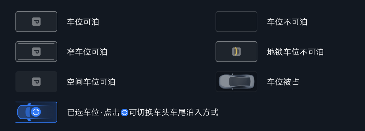 ,则驾驶员可点触该图标切换车头或车尾泊入。否则表明当前车位不支持切换泊入方式。