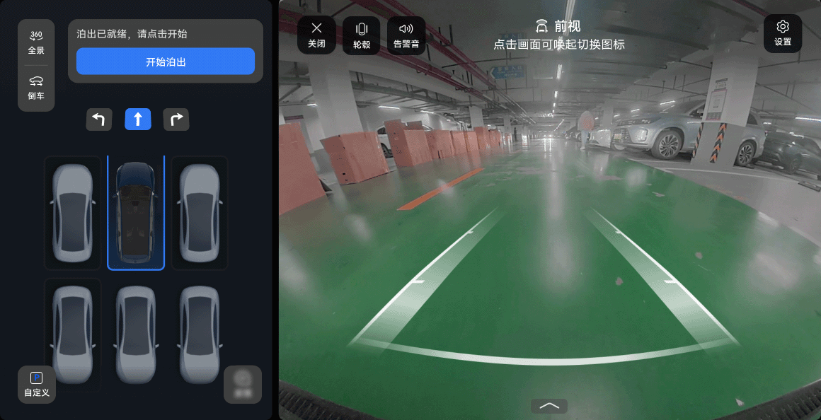 驾驶员选择泊出方向后,踩住制动踏板同时点触“开始泊出”,根据仪表屏提示松开制动踏板和方向盘。