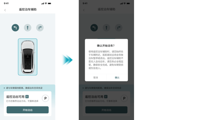 点触“遥控泊车辅助”,待系统完成自检后,选择泊出方向,再点触“开始泊出”并确认,一键控制车辆泊出车位。