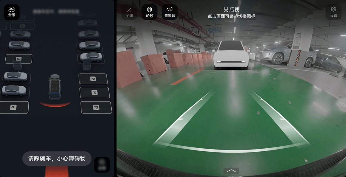 实施 RAEB 时,中控屏上会在自车后方显示动态红色弧线,并将风险目标红色高亮显示,伴有“请踩刹车”的文字提示,提醒驾驶员采取制动措施。