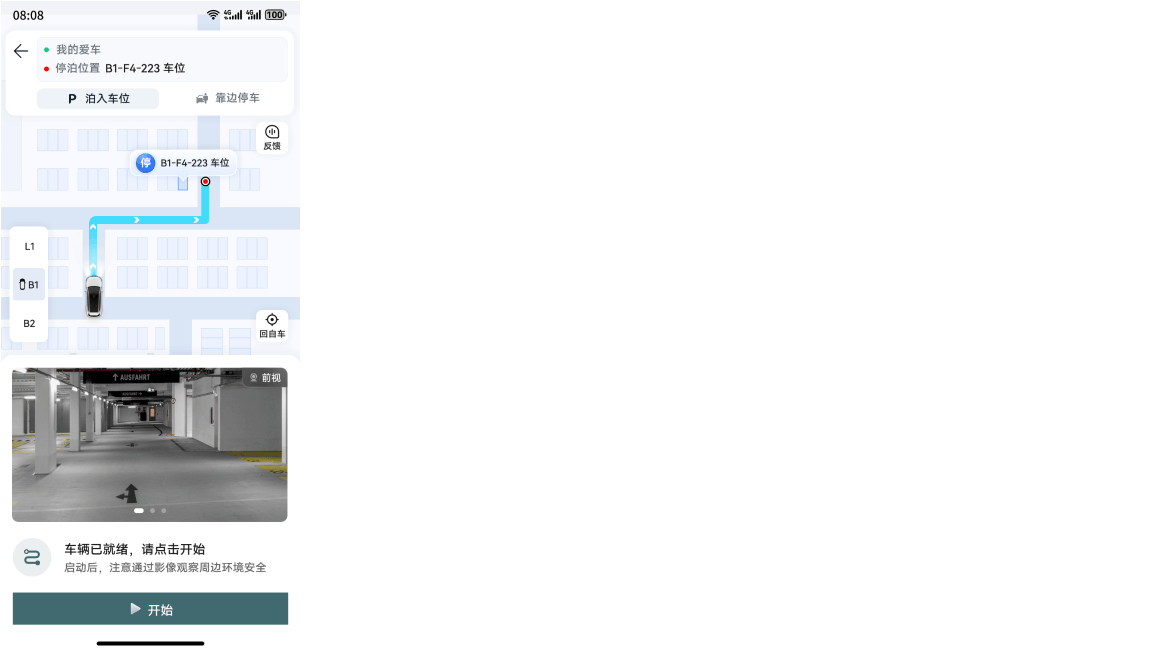 在“泊入车位”页签,点触“开始”,车辆将沿着系统规划的泊车路线行驶,并泊入目标车位。