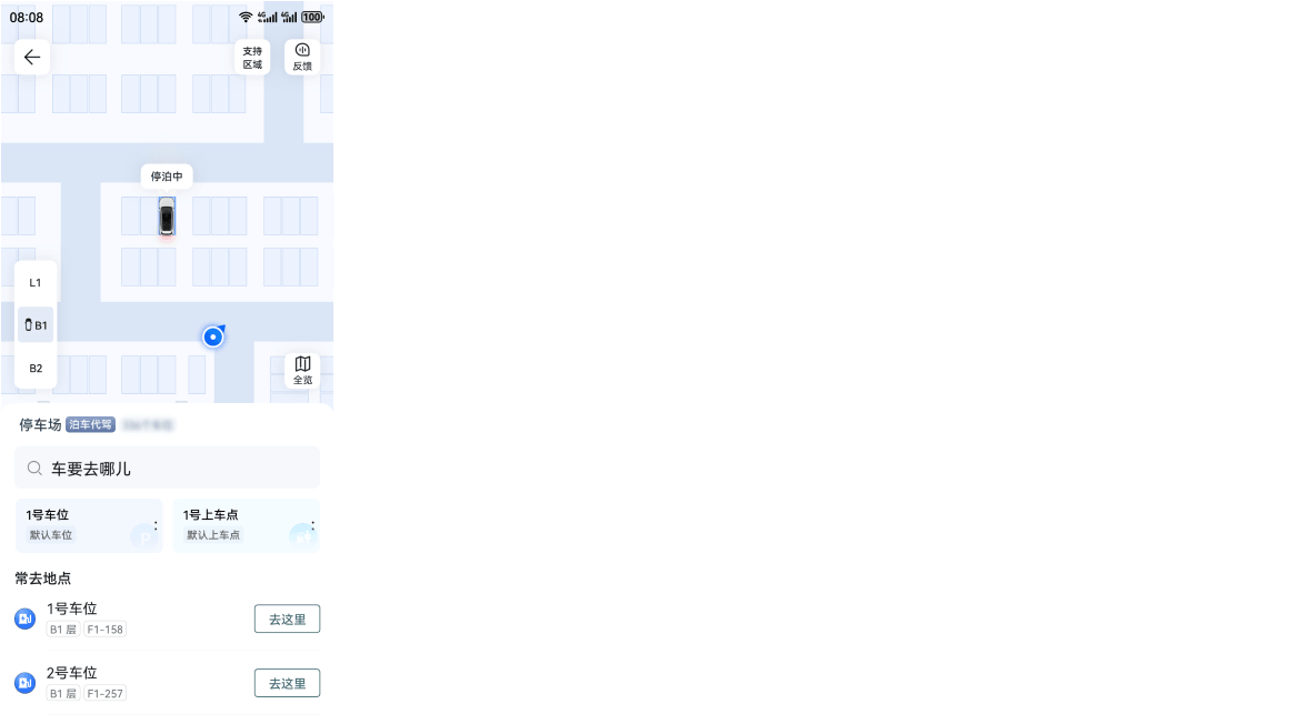 待系统完成泊车代驾条件自检后,手机岚图汽车 APP 显示当前停车场的平面图。
