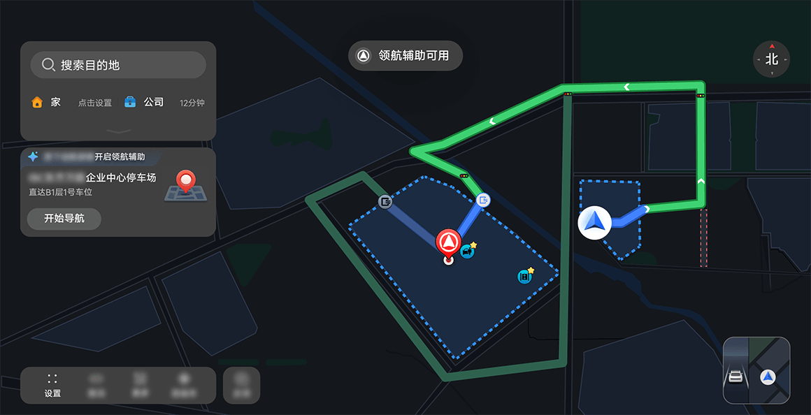 - 驾驶员在 ADS APP 上设置好到目的地导航路线后开始导航,或点触目的地推荐卡片上的“开始导航”按钮,观察中控屏ADS 状态岛是否显示“领航辅助可用”。如是,进入下一步。