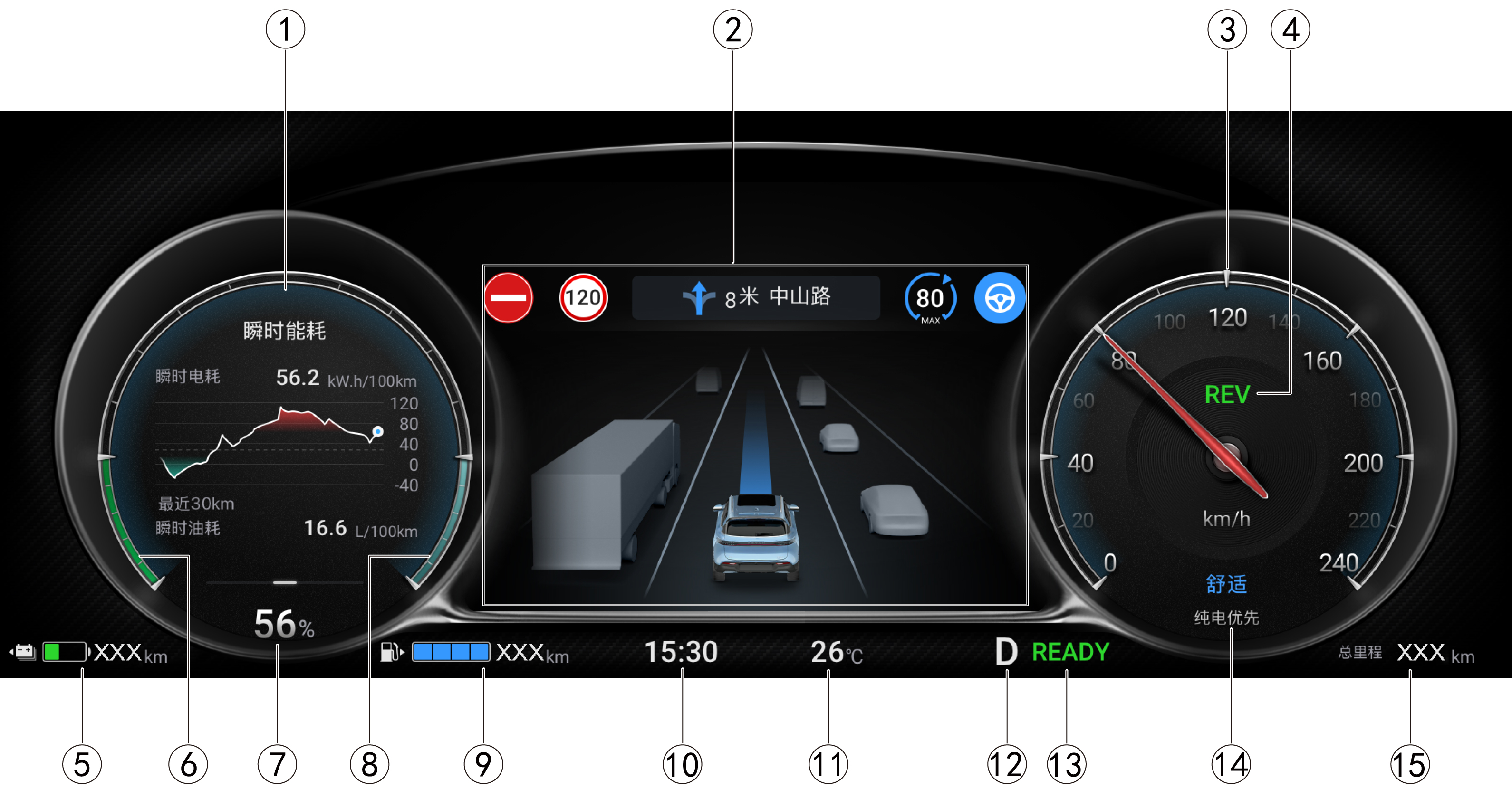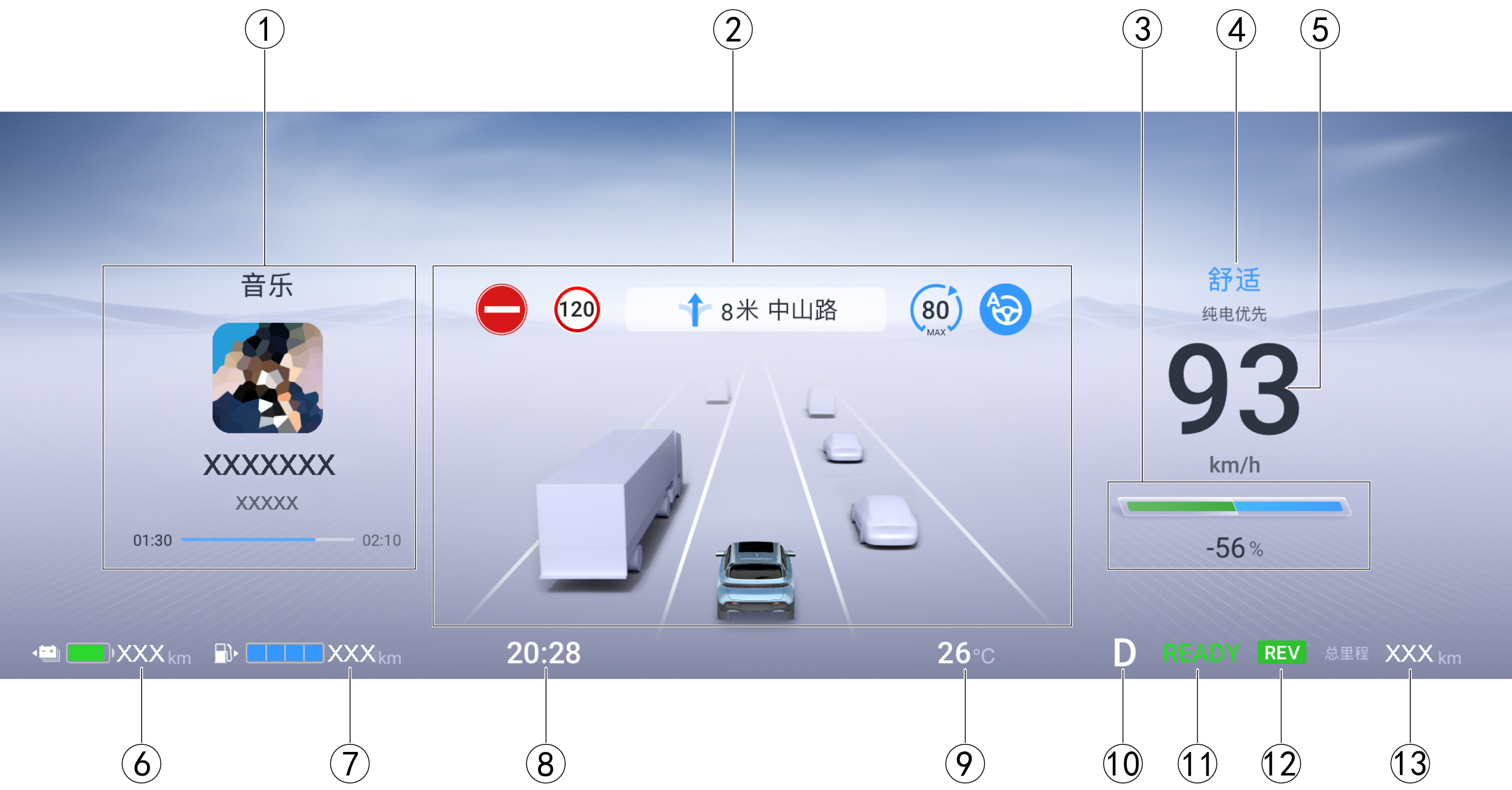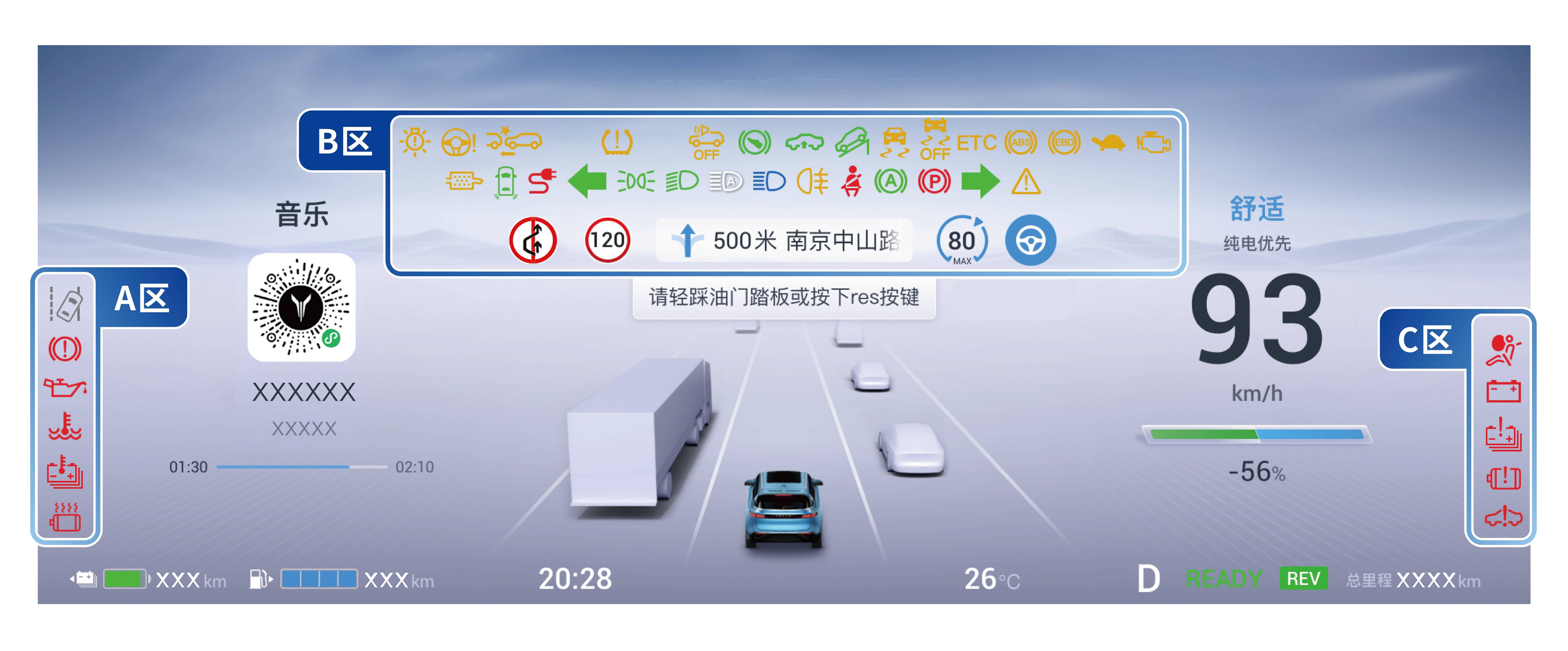 - 当切换驾驶模式时,组合仪表根据不同的驾驶模式显示不同颜色。
