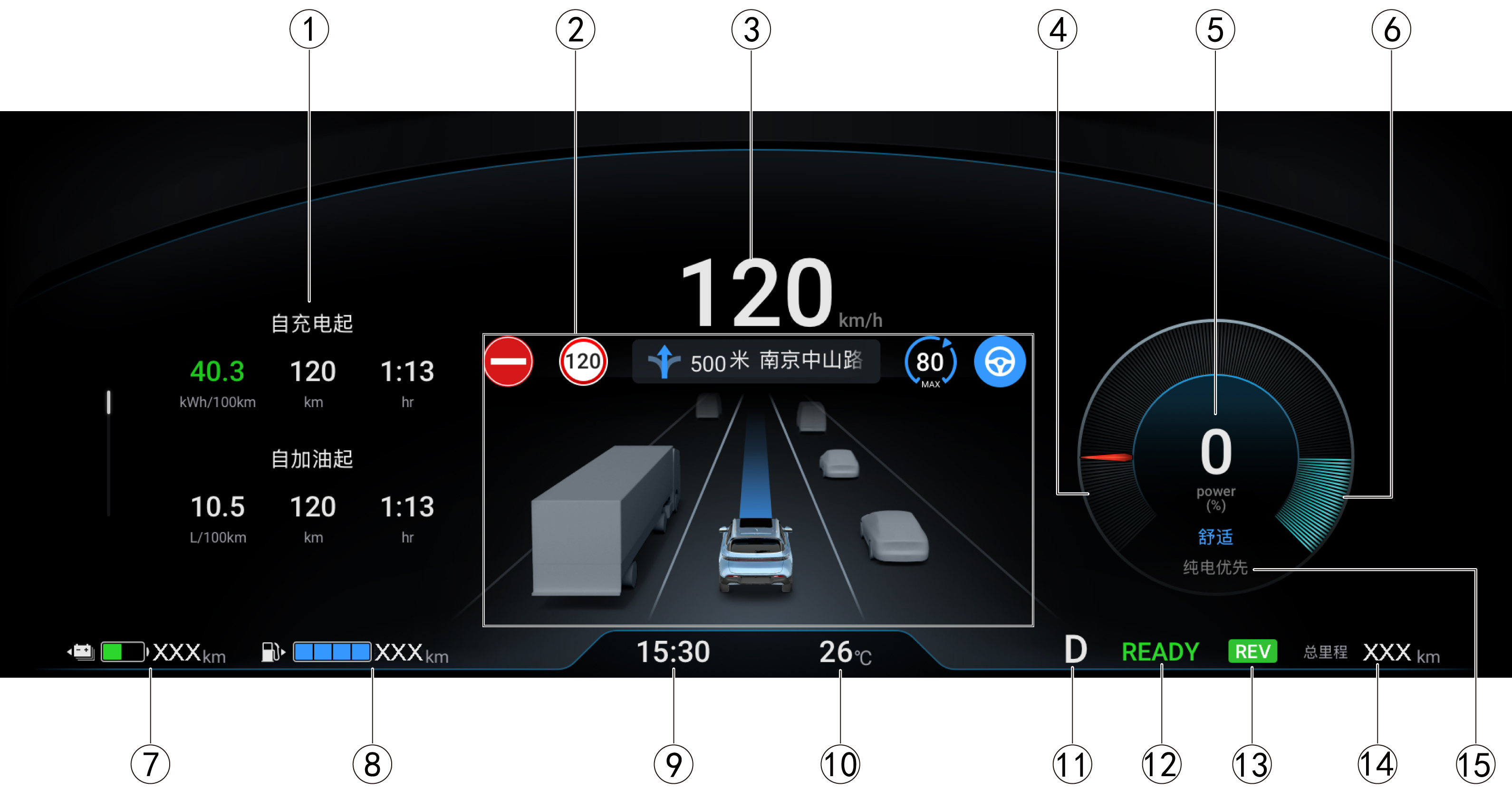 - 自充电起记录自上一次充电后纯电行驶数据,自加油起记录自上一次加油后增程器参与的行驶数据,自启动起记录本次启动总行驶数据。