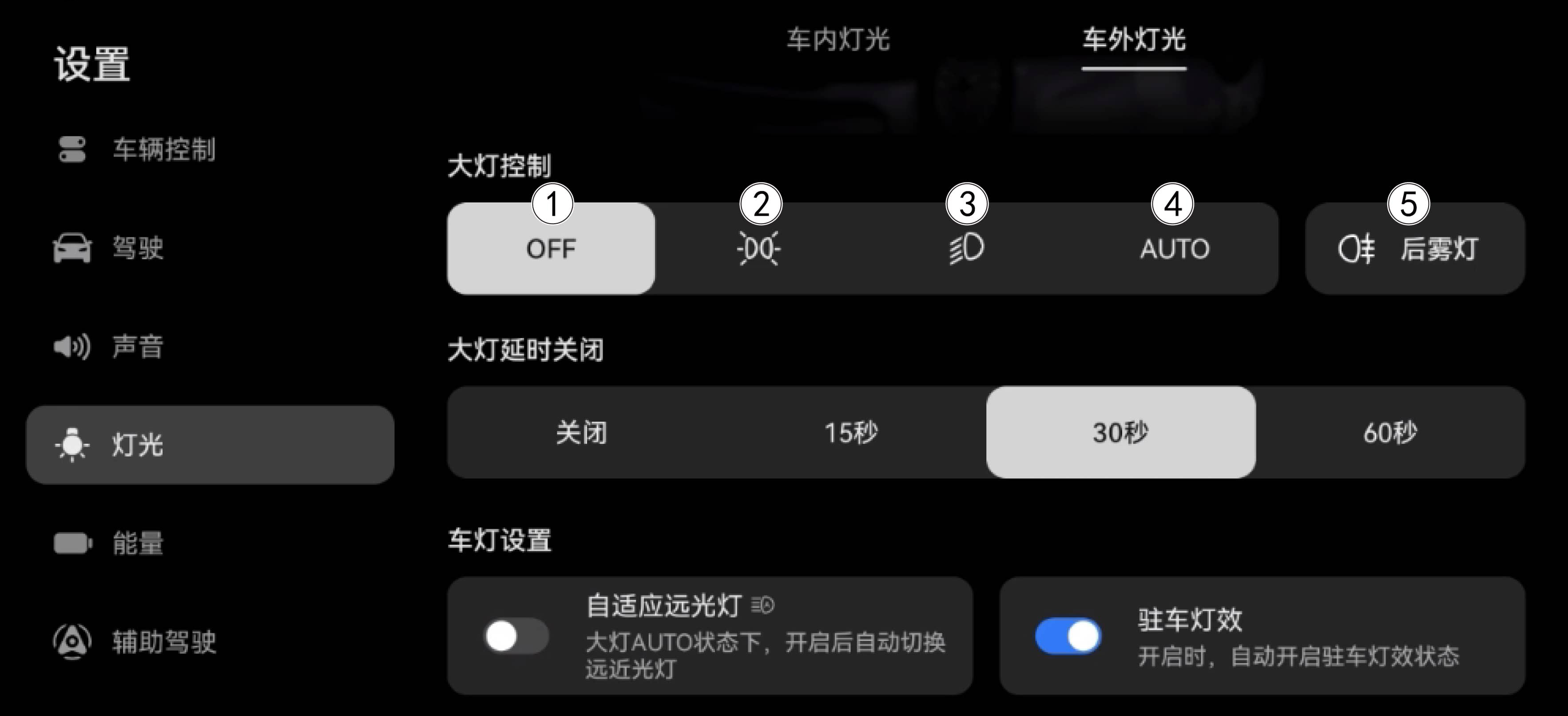可在中控屏进入“设置 > 灯光 > 车外灯光 ”,设置大灯延时关闭功能(关闭、 15 秒、30 秒、60 秒)。