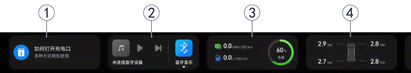 | ④ 胎压卡片 | 可以实时查看胎压信息,也可点击卡片可进入“设置 > 车辆状况”界面。 |