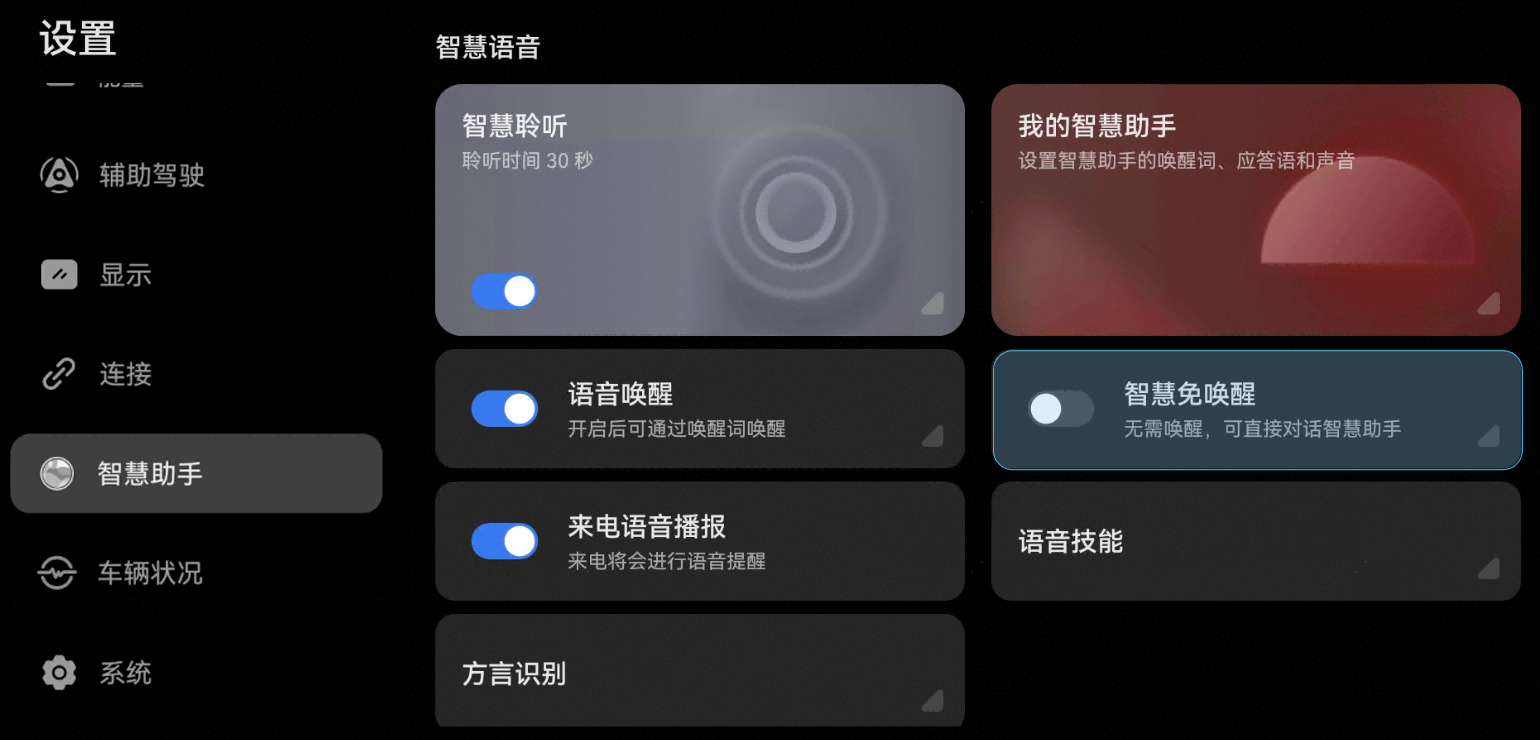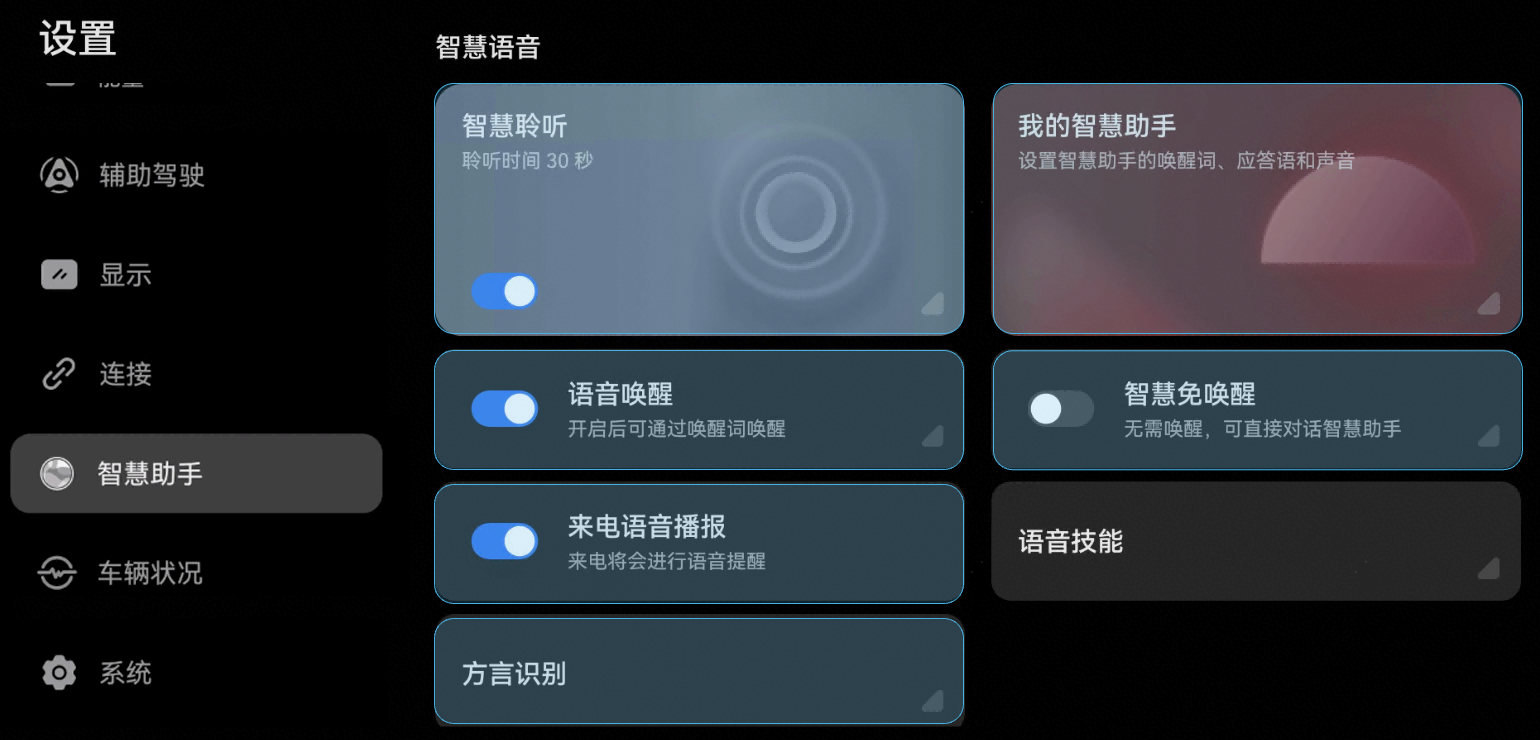 您可以在中控屏上点击“设置 > 智慧助手”,在智慧语音界面中设置如下功能。