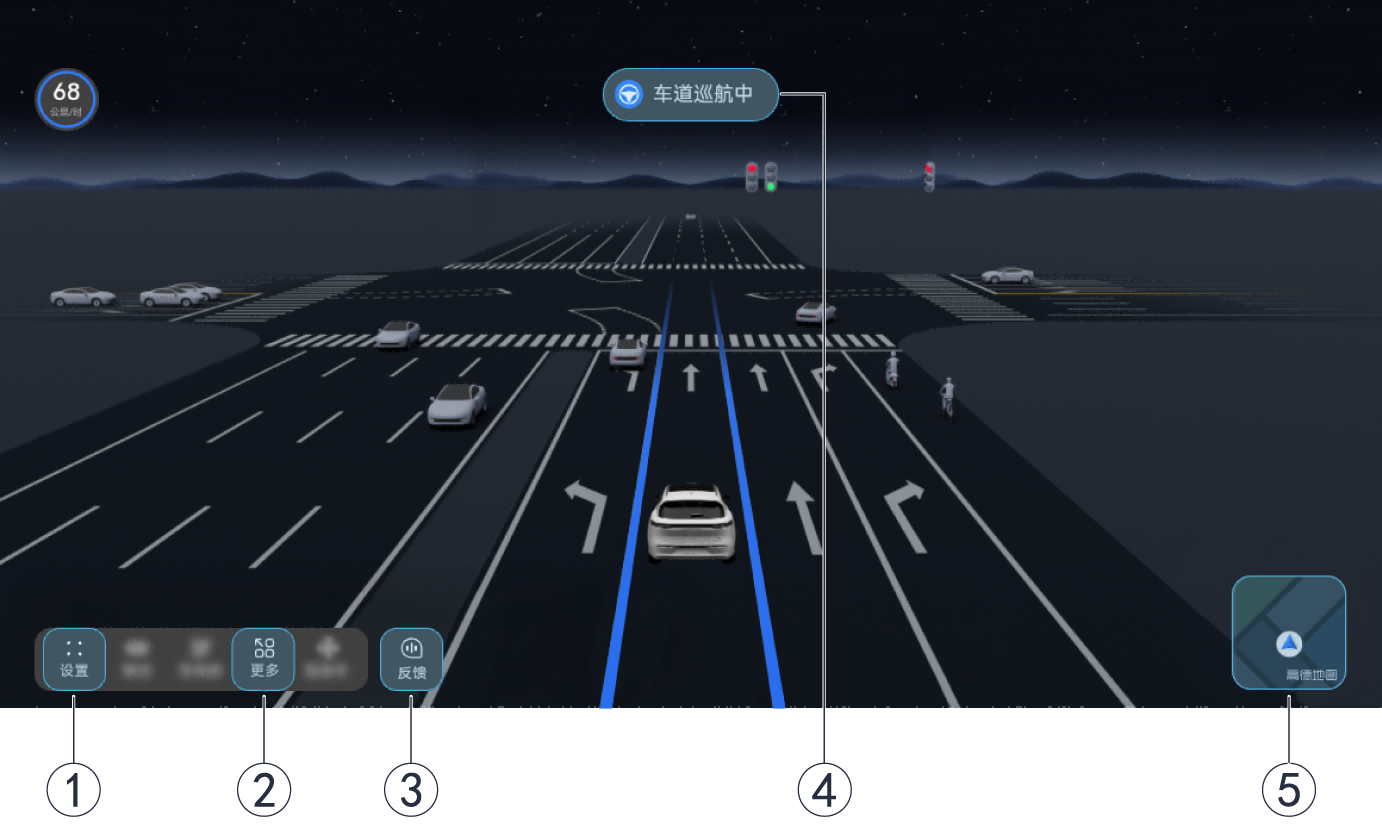 | ④ ADS 状态岛 | ADS 运行过程中的提示卡片,显示 ADS 状态变化、ADS 意图等信息。 在使用 NCA 时点击 ADS 状态岛可以切换至 LCC,详情请参阅切换至 LCC。 |