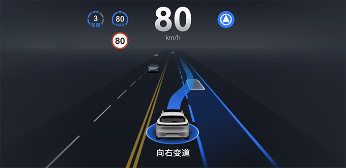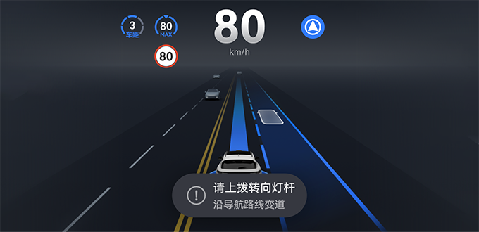 变道时,组合仪表上目标车道和车道线会蓝色高亮,车辆的目标位置显示为白色矩形。