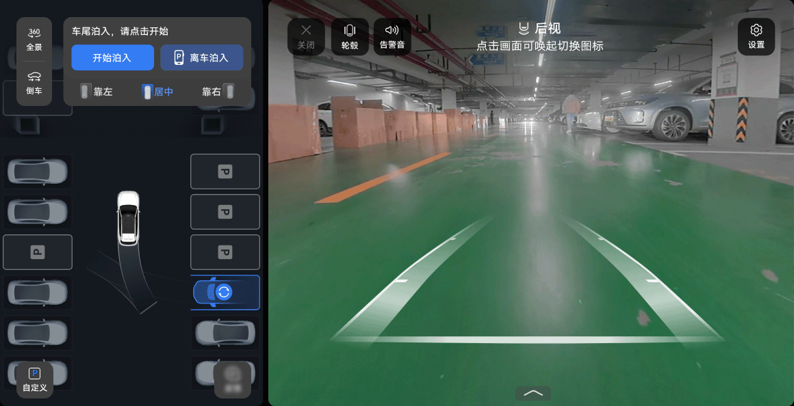 请确认中控屏的“设置 > 辅助驾驶 > 全景环视”已设置了挂 R 挡默认打开“泊车辅助”。 - 在 360°全景环视界面点触左上角